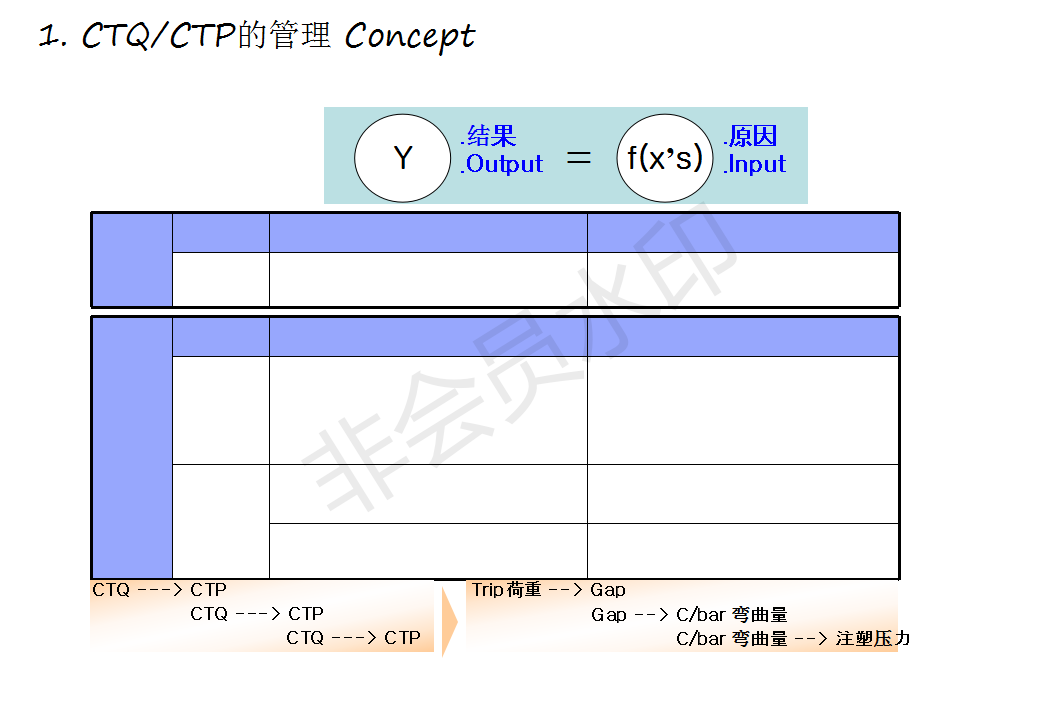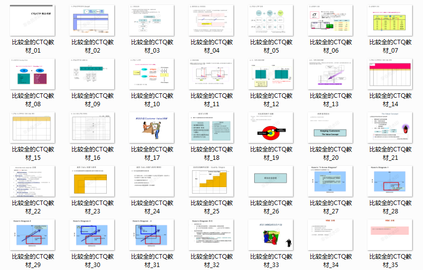 在日常工作中,常在控制计划,或者FMEA,或者工序SOP中看到CTQ/CTP字样的特殊标识,往往遇到这样的标识时,工程师都会告诉我们需要重点关注! 那到底什么是CTQ/CTP?怎么识别出CTQ/CTP?识别的过程需要怎么做呢? 下面就送给大家一份CTQ/CTP概念理解培训课件,相信看完这份课件,您就都理解了! 文末附领取方式 ! 1、什么是CTQ/CTP? CTQ:Critical-To-Quality(关键质量特性),该概念在六西格玛管理中常被提到,将其作为一个输出的衡量性指标。顾客最在意的产品或服务特性。 CTP:Critical-to-process(关键过程特性),实现结果的最佳过程条件,诱发问题的因子;会造成80%不良的20%的关键管控点。 2、怎么识别CTQ/CTP。 CTQ:关键质量特性 ①首先要从客户需求角度出发,从VOC中转换出CTQ。 ②从NUDD处延展出来。 ③从量产的问题点检讨或不良率的主要不良中来,我们在分析原因时也可找出CTQ。 ④从对产品规格及特性充分研究中来。 CTP:关键过程特性 ①首先要画出产品的制造流程图,以影响良品率的角度来推倒关键制程。 ②依Y=f(x)的因果关系原理来分析确认关键因子是什么。