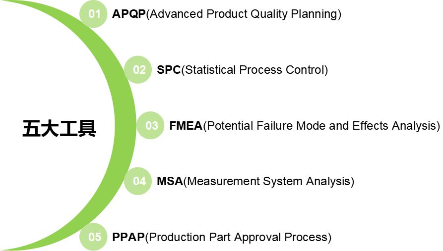 五大工具主要包括APQP、FMEA、PPAP、SPC、MSA,他们之间相互联系又相互独立,共同交织出一套系统的质量管理方法。APQP是总框架,PPAP是APQP产出,FMEA是大过程中的风险识别工具,识别出来的高风险项目,要用SPC控制,MSA是SPC的前期工具,保证测量系统可靠。